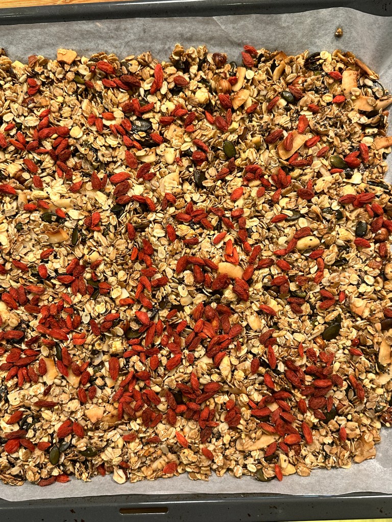 - Let the granola cool completely on the sheet — it will crisp up as it cools. Once cool, break it into pieces and stir in the goji berries.
